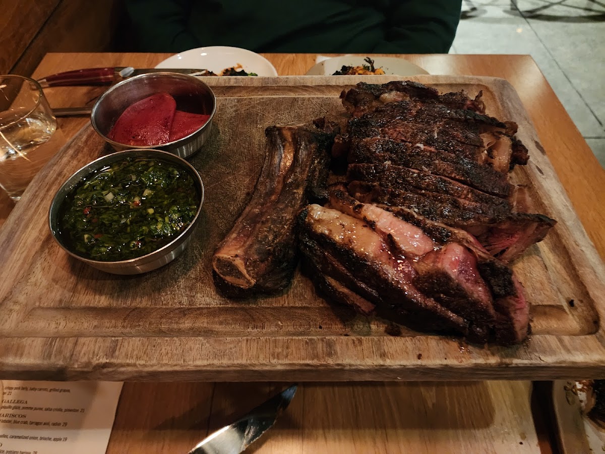 As you venture into the Asador Meat & Seafood section, the Pescado a la Parilla takes center stage. This whole wood-grilled market fish is not just a dish; it’s an experience, beautifully charred with a light mojo rojo and fried garlic that draws you in with its aromatic charm. For meat lovers, the Chuletón — a stunning 32oz Angus bone-in ribeye — promises a feast that is both indulgent and memorable, especially when paired with their rich tempranillo bordelaise sauce.